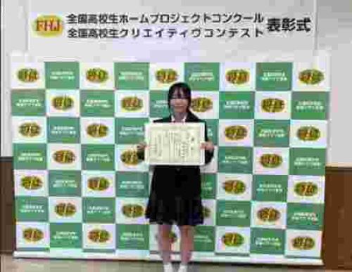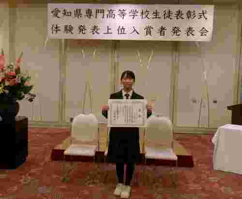 愛知県産業教育振興会主催「令和7年度専門高等学校生徒体験発表」において、生活文化科3年の井上璃心さんが3位に入賞しました。11月に行われた表彰式及び上位入賞者発表会に出席し、「伝統文化を次世代へ」というテーマで、生活文化科での学びと自身の夢について、落ち着いて堂々と発表することができました。